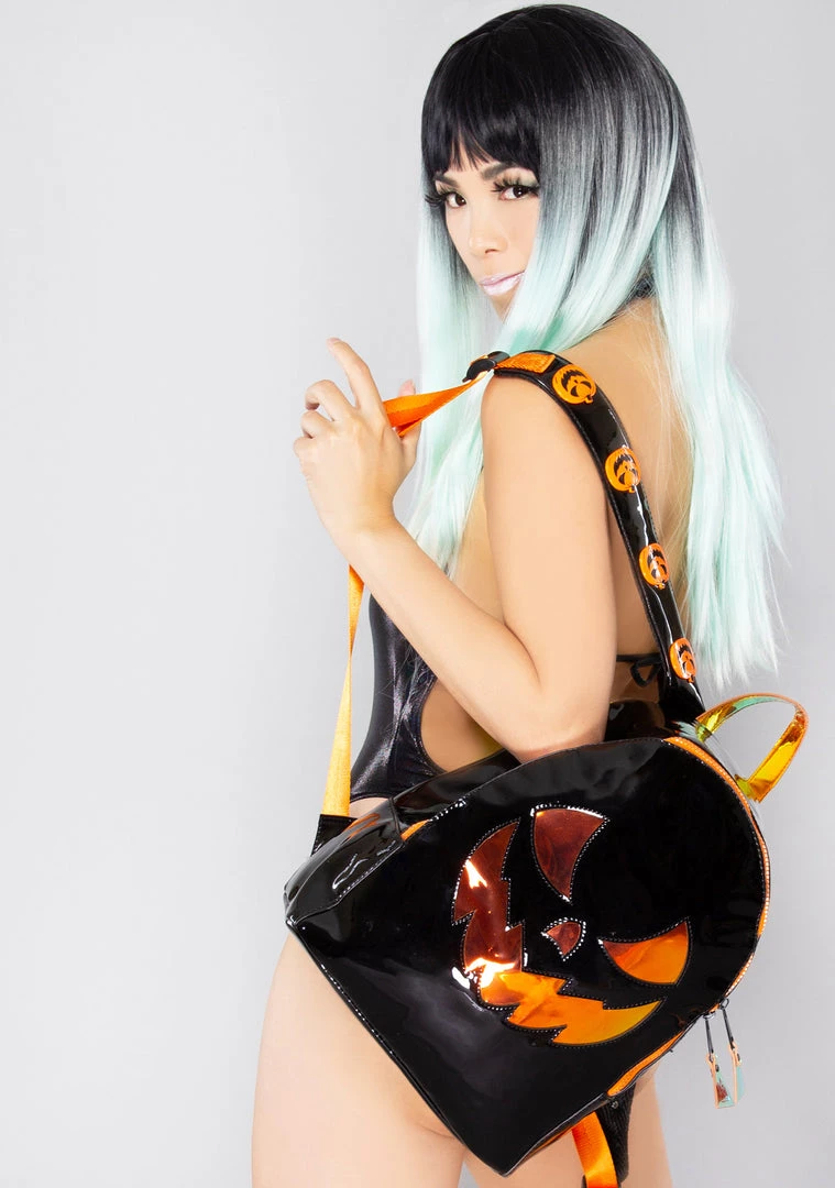 Celebrate Halloween all year long in the Jackolantern Baqpaq in Black Orange by Y.R.U. This hauntingly cute festival backpack features a black patent body, orange jack-o-lantern face details, adjustable straps, and a zipper closure. #StaySpooky