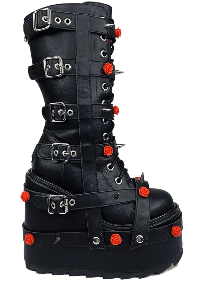 Show them you have beauty with a bite with the Dune Bondage Rose in Black Red from YRU. These killer rave platform boots feature a black vegan leather upper, matching black bondage straps, red enamel rose and silver spike hardware, and zipper closure up the back. They can look but don’t touch!