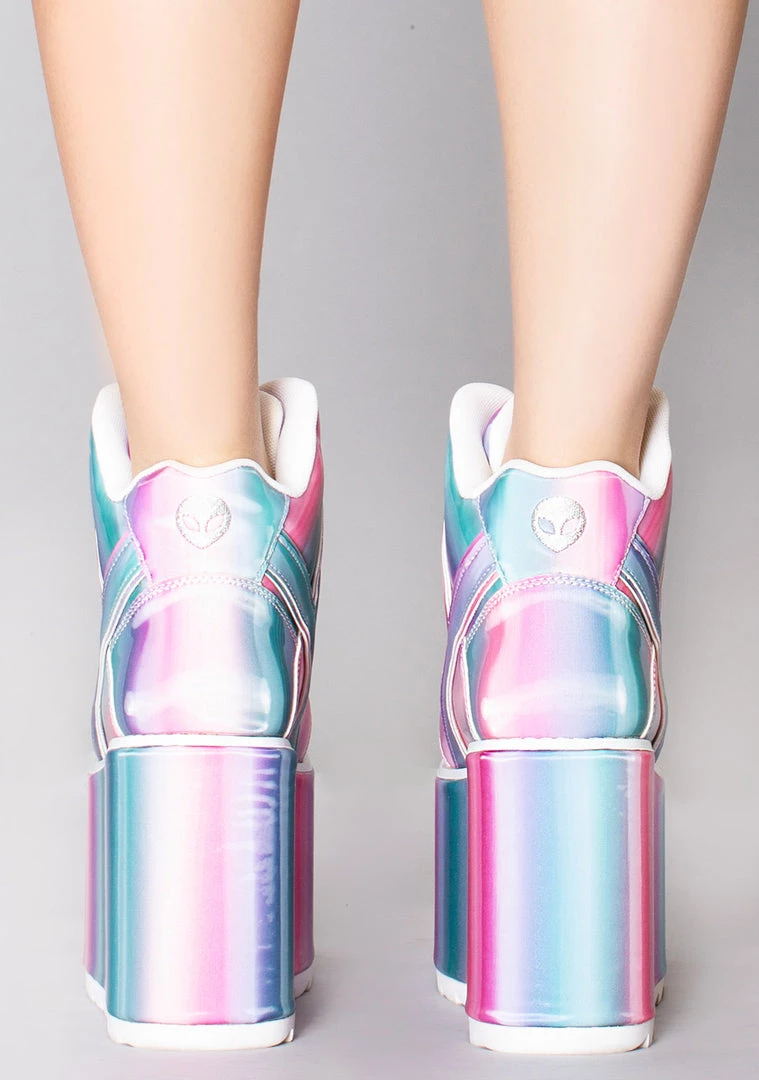 Look sweeter than a card shop in the Qozmo Platform Sneakers from YRU. These deliciously adorable platform sneakers feature a pastel lenticular upper and wrapped sole, lace up front, and white chinky tread bottom sole. With these cute sneakers, you’re sure to give them a toothache!