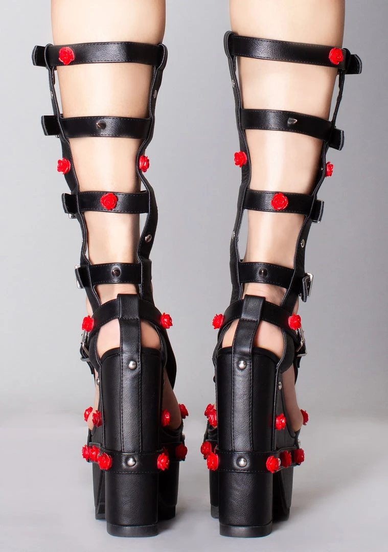 Let them know your beauty has a bite with the Nightcall Hi Rose Platform Heels from YRU. These seductive platform heels feature a PU leather material with bondage-style upper, adjustable multiple strap openings, red rose embellishments, spike stud accents, and rubber sole with major traction. Every rose has its thorns.